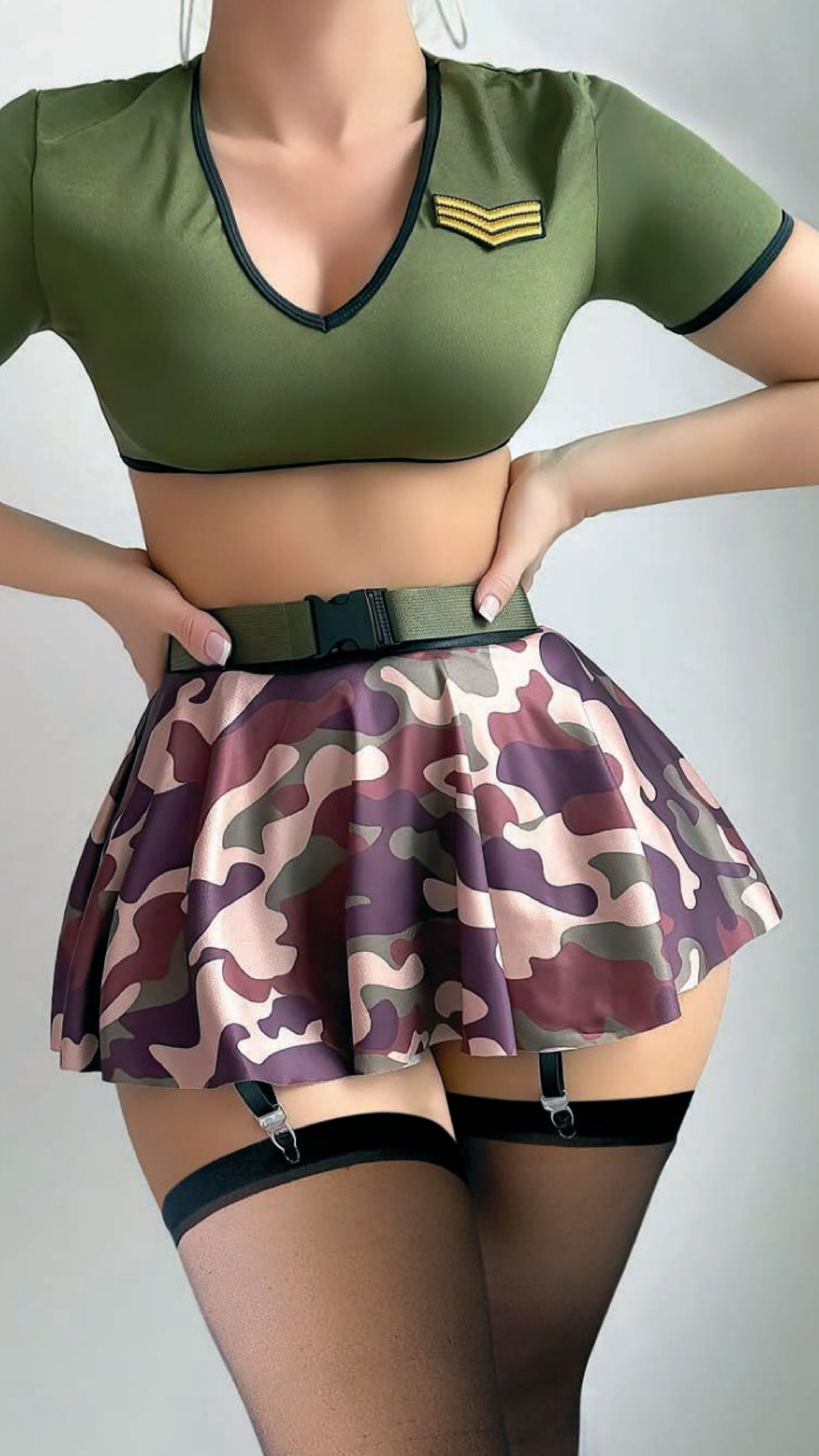 Step into your power with this sexy army-inspired lingerie set. Featuring a camouflage mini skirt...