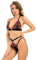 Discover a bold yet elegant look with this red floral embroidered strappy lingerie set, designed to enhance natural curves with its soft mesh cups and adjustable straps. The high-cut thong features coordinating embroidery and sleek strap detailing, offering a confident and sophisticated silhouette. Perfect for special occasions, gifting, or elevating your intimate wardrobe.