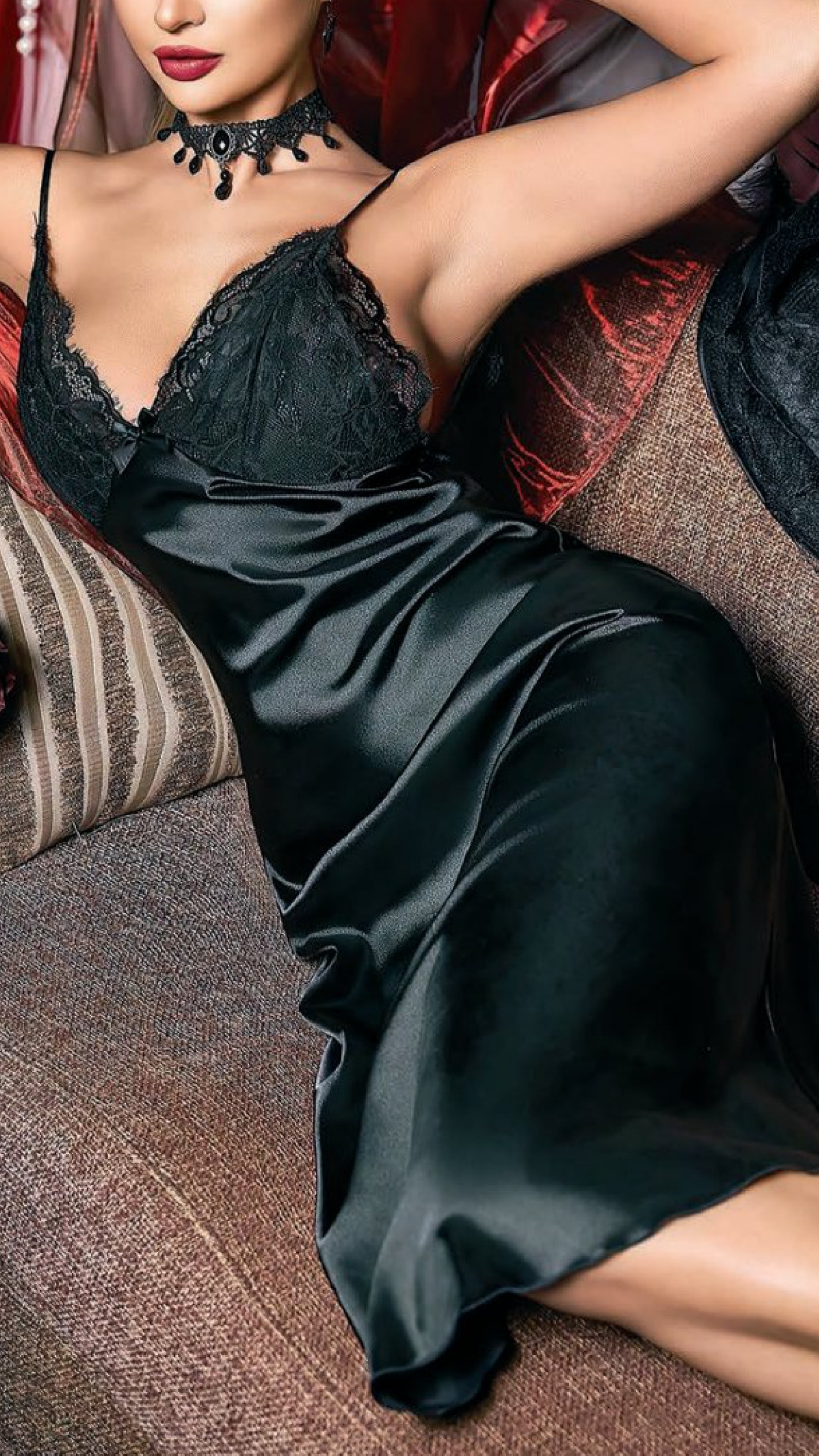 Indulge in timeless elegance with this luxurious satin night dress, designed to make every night unforgettable. Crafted from silky satin fabric, it drapes beautifully over the body, offering a smooth and sensual feel against the skin. The deep lace V-back and delicate lace cups add a touch of sophistication and allure, making this piece perfect for romantic evenings or self-pampering nights.