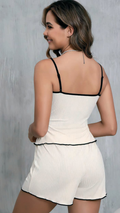 Elevate your loungewear with this elegant pleated pajama set, featuring a soft sleeveless top adorned with delicate black ribbon bows and matching shorts. Designed for both comfort and allure, this set is perfect for cozy nights or stylish lounging at home.