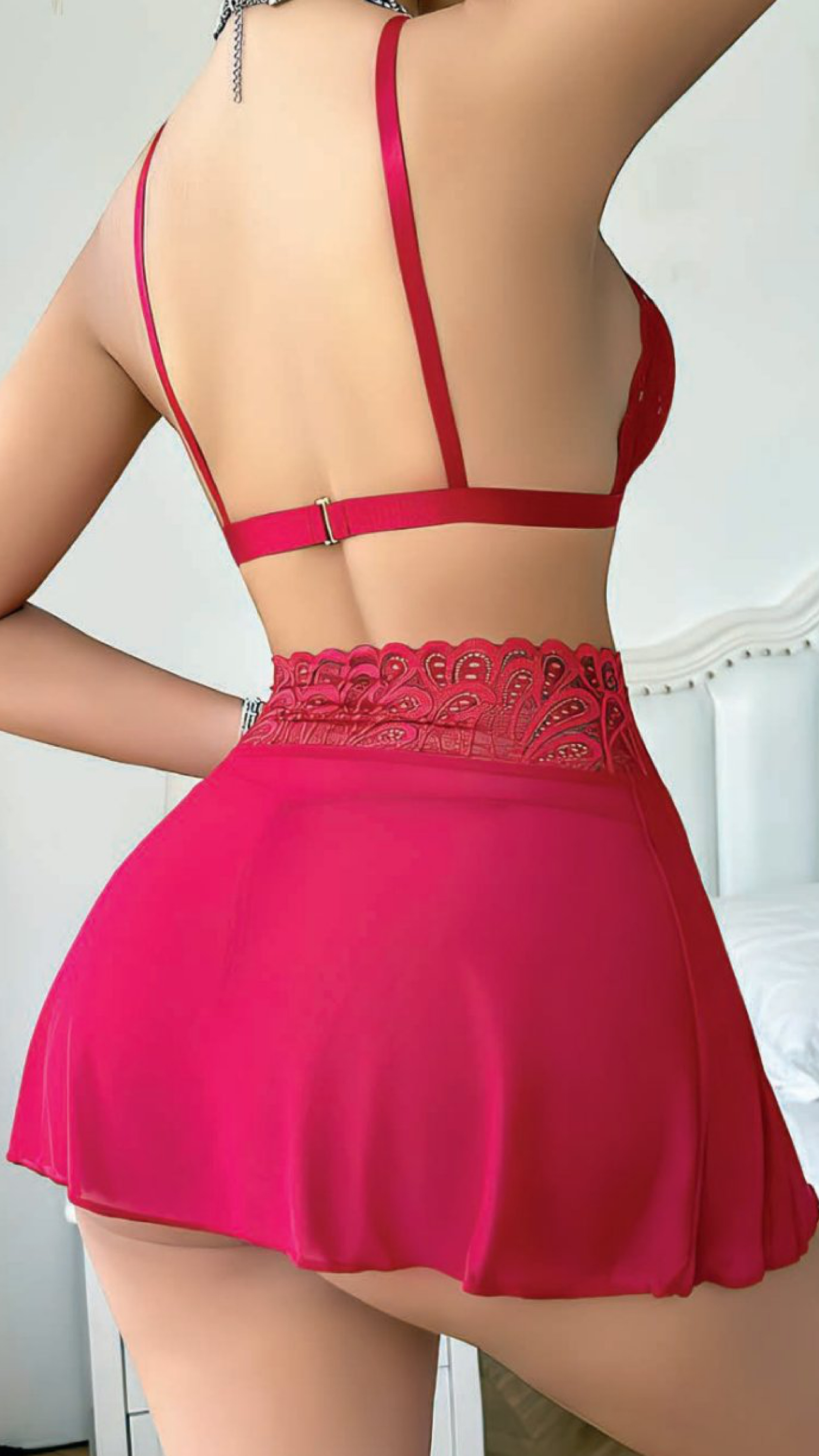 Indulge in a seductive blend of elegance and allure with this exquisite lingerie set. Featuring a beautifully detailed lace bra with strappy accents and a high-waisted sheer mesh skirt that flatters every curve. Perfect for romantic nights, special occasions, or simply embracing your sensuality in style.