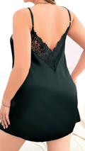 Indulge in timeless elegance with this black satin chemise featuring delicate lace detailing. The silky smooth fabric drapes beautifully, while the lace-trimmed neckline and back add a romantic, feminine touch. Perfect for both cozy nights and special occasions.