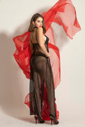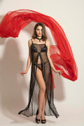 Turn every entrance into a show-stopping moment with Midnight Mesh, a daring mesh gown that reveals just enough to leave them wanting more. Featuring adjustable spaghetti straps, a flowing open-front design, and sleek faux leather trim, this set comes complete with a matching mesh thong and a bold O-ring choker for a touch of dominance and allure. Perfect for nights when you want to command attention.