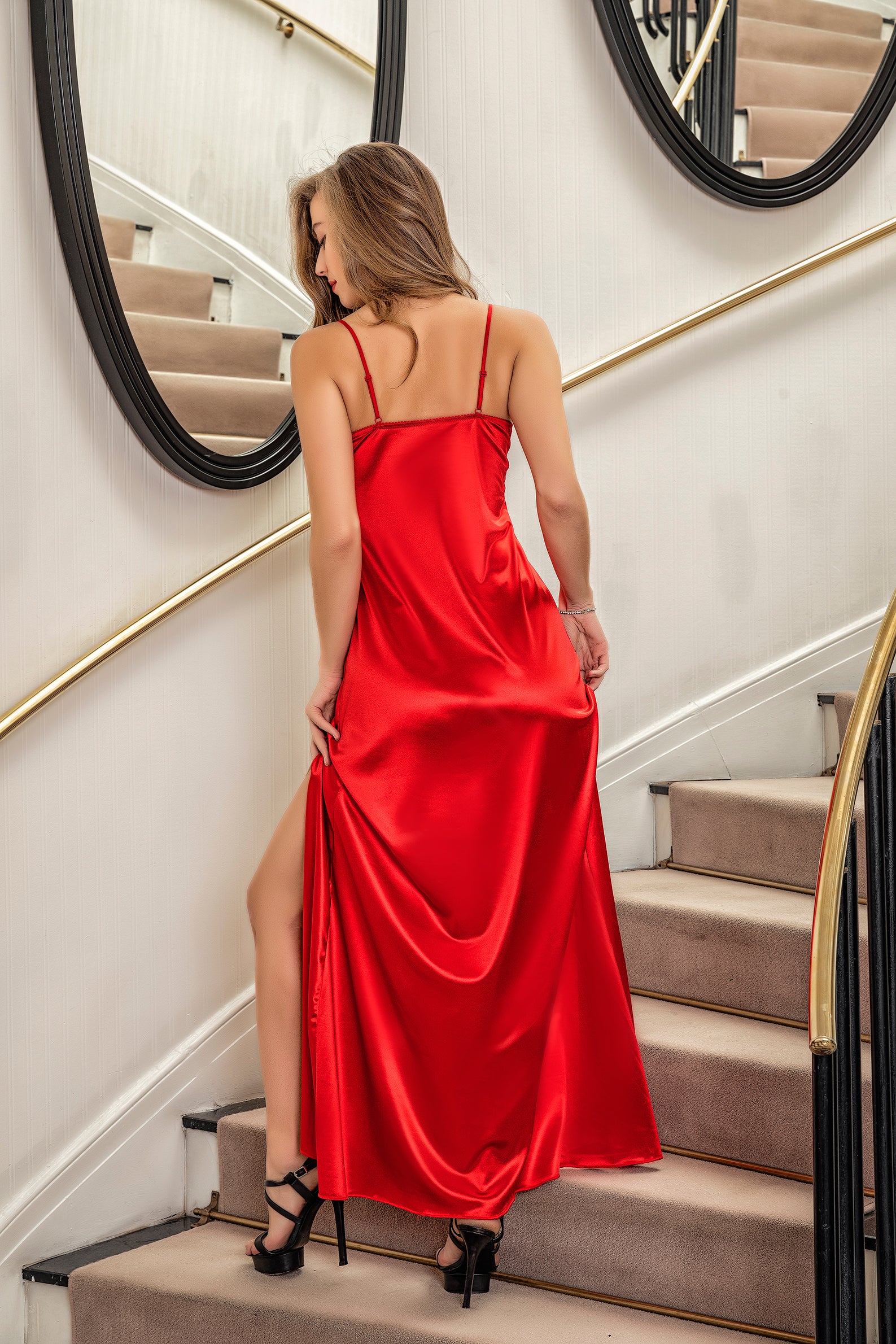 Indulge in the allure of midnight elegance. Crafted from silky satin and delicate lace, this long gown features a daring side slit and a sensuous lace-trimmed bodice that flatters every curve. Designed to captivate, it comes with a matching thong for a complete look. Perfect for unforgettable evenings and intimate moments, this piece is the definition of seductive sophistication.