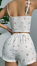 Indulge in the charm of this floral lace cami and shorts loungewear set, designed for ultimate comfort and feminine elegance. Made from soft ribbed fabric, this delicate white set is perfect for warm nights and relaxing weekends. Featuring tiny floral prints, adjustable straps, and lace trim details, it brings a touch of romance to your everyday moments.