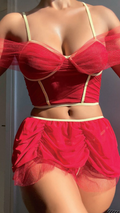 Turn up the heat with this striking red sheer lingerie designed to captivate. Crafted from delicate tulle and finished with gold trims, this set features a structured bustier with underwire cups for a lifted silhouette, romantic off-shoulder tulle sleeves, and an adjustable lace-up back that accentuates every curve. The ruched mini skirt adds a flirty finish — perfect for a seductive night or a bold fantasy look.