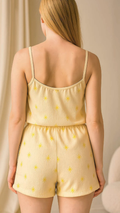 Experience effortless comfort with this Soft Yellow Star Print Pajama Romper. Crafted from lightweight, breathable fabric, this sleeveless design is perfect for warm nights and cozy mornings. The elastic waistband with adjustable tie ensures a flattering, comfortable fit, while the delicate star pattern adds a playful touch to your loungewear collection.