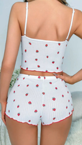 Add a playful yet chic touch to your loungewear with this ribbed camisole and shorts duo, featuring a charming strawberry print on soft, stretchy fabric. Available in both classic white and elegant black, this set combines comfort with cute details — from the scalloped hem to the delicate lace neckline. Perfect for cozy nights in or lazy weekend mornings.