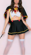 Step into a world of fantasy with this Witchy Schoolgirl Costume. Featuring a pleated mini skirt, white crop top, and matching cape with gold and red trim, this enchanting outfit is perfect for themed parties, roleplay, or intimate nights. The soft, stretchy fabric ensures comfort, while the playful design adds a touch of magic to your lingerie collection.